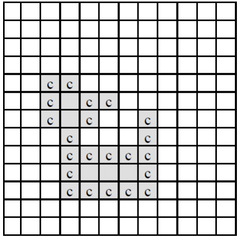 이 치즈를 공기 중에 놓으면 녹게 되는데 공기와 접촉된 칸은 한 시간이 지나면 녹아 없어진다. 치즈의 구멍 속에는 공기가 없지만 구멍을 둘러싼 치즈가 녹아서 구멍이 열리면 구멍 속으로 공기가 들어가게 된다. <그림 1>의 경우, 치즈의 구멍을 둘러싼 치즈는 녹지 않고 ‘c’로 표시된 부분만 한 시간 후에 녹아 없어져서 <그림 2>와 같이 된다.
