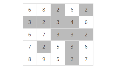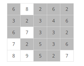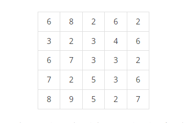 어떤 지역의 높이 정보는 행과 열의 크기가 각각 N인 2차원 배열 형태로 주어지며 배열의 각 원소는 해당 지점의 높이를 표시하는 자연수이다. 예를 들어, 다음은 N=5인 지역의 높이 정보이다.