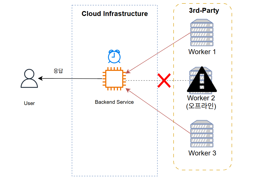 첫 번째로는 서드 파티 워커의 경우, 클라우드 환경에서 각 워커가 네트워크/인프라 문제로 인해 연결이 불가능할 수도 있다. (예: 외부 회사가 새 릴리즈를 롤아웃하는 중일 경우, 정전으로 인해 서버가 다운된 경우 등)