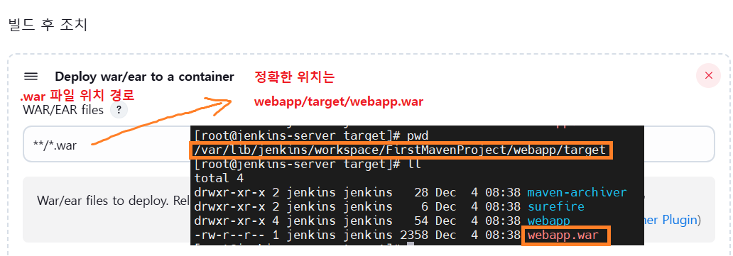 - 빌드 후 조치 추가 - WAR/EAR files: Deploy war/ear to a container → 이 부분에서 깃헙 프로젝트에 있는 webapp.war가 저장된 파일 경로를 입력해야 한다. webapp/target 디렉터리에 있지만, 일반적으로 **/*.war를 사용한다.