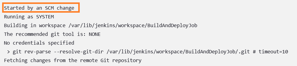 로그를 확인하기 위해 console output 탭으로 가서 빌드 과정을 살펴보면 SCM으로 인해 빌드되고 있다는 문구를 볼 수 있다.