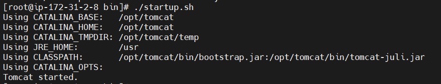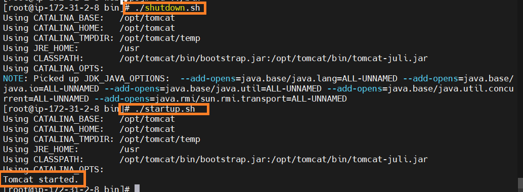 /opt/tomcat/bin 디렉토리로 돌아가 ./shutdown.sh를 실행하여 톰캣 서비스를 종료한 뒤 다시 ./startup.sh를 입력하여 실행한다.