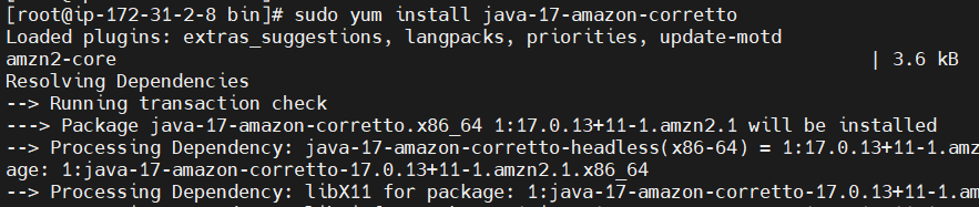 root 계정으로 전환하여 java와 호환되는 corretto17를 활성화한 뒤 java17을 설치한다.
