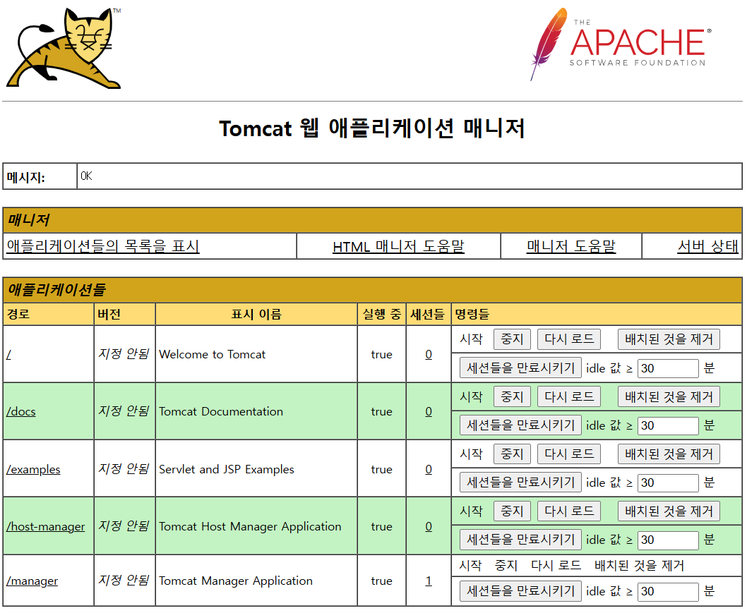 사용자 등록 후 서비스를 다시 시작하고 톰캣 관리자로 로그인한다.