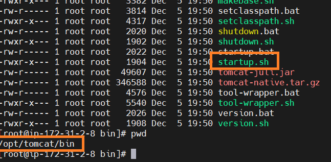 /opt/tomcat/bin 디렉터리에 진입하여 ll 명령어로 파일을 살펴보면 startup.sh라는 파일을 확인할 수 있는데, 이 파일은 Tomcat을 시작하기 위한 스크립트가 담겨있다.