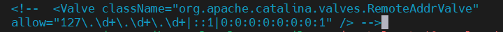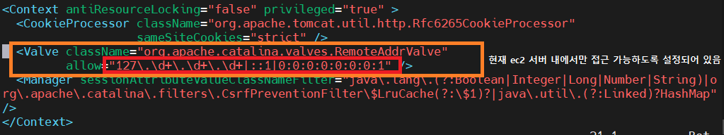 파일을 열어보면 Value 태그를 확인할 수 있는데, 리눅스 환경(톰캣 서버)에서만 접근할 수 있도록 작성되어 있다. 이를 주석해주면 외부 브라우저에서도 접근이 가능해진다.