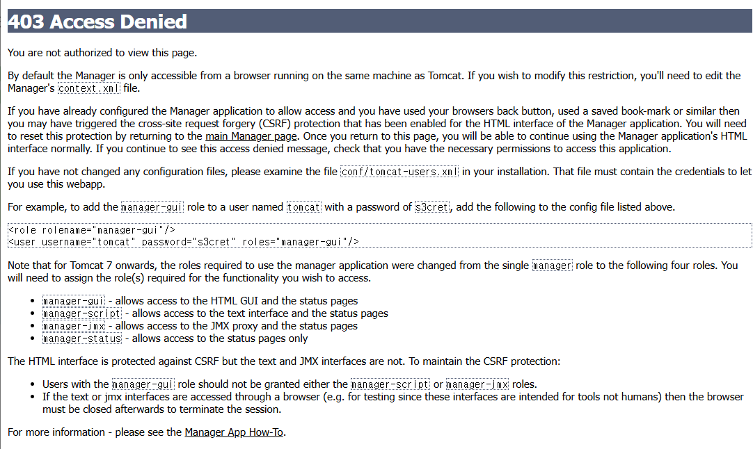 host-manager와 manager에 있는 context.xml 파일에 주석 처리를 한 뒤 톰캣 서비스를 재시작해야 한다.