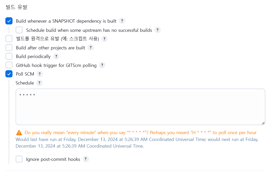 우리가 사용할 빌드 트리거는 Poll SCM이다.