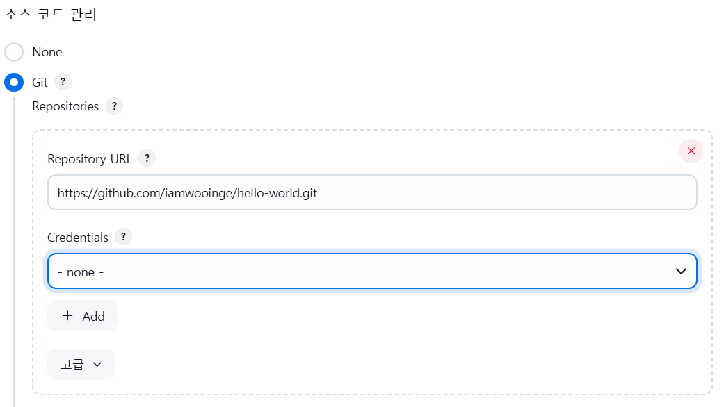 다양한 빌드 트리거가 존재하는데, 현재 체크된 항목은 수동 빌드이다. (기본 설정임)