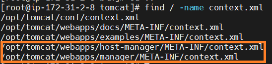 find / -name context.xml 명령을 사용하여 context.xml 파일을 검색하면 총 5개의 파일이 보인다.