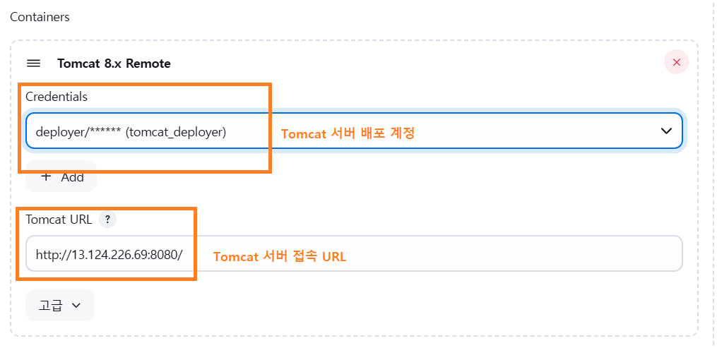 - 빌드 후 조치 추가 - Containers: 톰캣 9는 플러그인에 문제가 있기 때문에 8을 선택한다. URL은 톰캣 서버에 접속하기 위한 IP:Port이다.