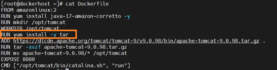 그리고 또 현재 사용하려는 이미지(amazonlinux:2)에서 tar 명령어가 없기 때문에 에러가 생긴 것이기 때문에 압축 파일을 해제하기 전에 tar 패키지를 설치하는 RUN yum install -y tar 명령어를 추가해줌으로써 해결했다.
