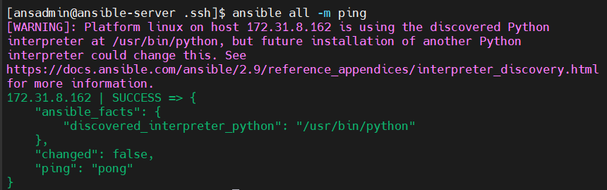 정말 가능한지 ansible all -m ping 명령어를 이용하여 통신 상태를 확인한다.