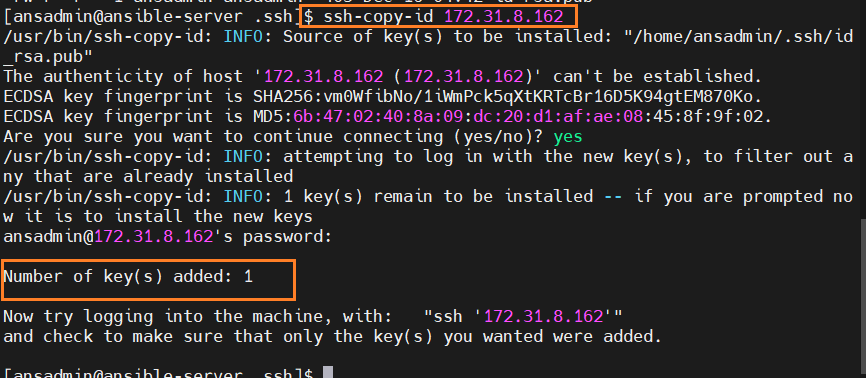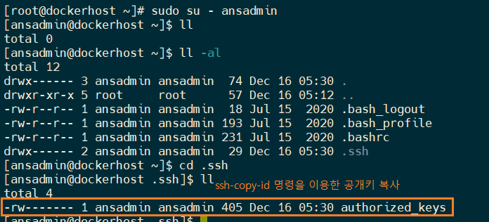 ssh-copy-id 명령을 이용하여 공용키를 dockerhost에 복사하여 ansible이 원격 접속할 수 있도록 한다.