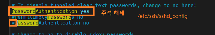 패스워드 기반 인증을 할 수 있도록 /etc/ssh/sshd_config 파일을 수정한다.