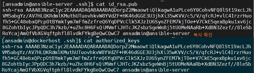 ansible-server의 공용키와 dockershot의 공용키 내용을 살펴보면 동일한 것을 확인할 수 있다.