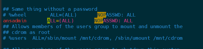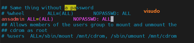 visudo 명령을 이용해 ansadmin에게 패스워드 입력 없이 서버를 사용할 수 있도록 권한을 부여한다.