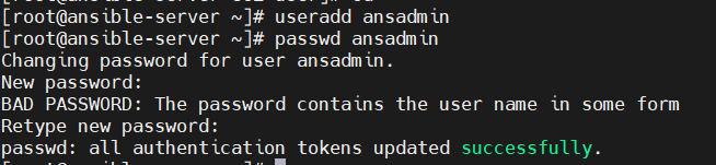 useradd, passwd 명령을 이용하여 Ansible 관리자 계정을 생성한다. 이름은 ansadmin이라고 했다.