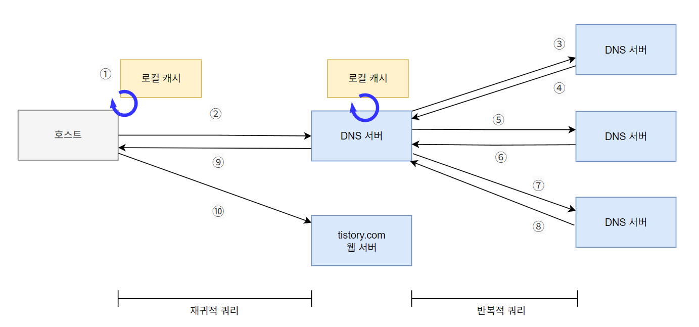 - 로컬 캐시에 없을 경우 반복적 쿼리 수행(4~8): 다른 상위 DNS 서버로 요청을 전달하게 됨. (4) 최상위 DNS 서버(TLD 서버)로 쿼리를 전송하여 해당 도메인에 대한 정보 요청. (5) TLD 서버는 tistory.com 도메인에 대한 정보를 가지고 있는 하위 권한 DNS 서버로 요청 전달. (6~8) 반복적 쿼리가 계속되며, 최종적으로 tistory.com 웹 서버에 대한 IP 주소 찾음