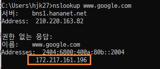 * 도메인 주소의 실제 IP를 알아내고 싶다면 명령 프롬프트에서 nslookup 도메인 주소를 입력하면 된다!