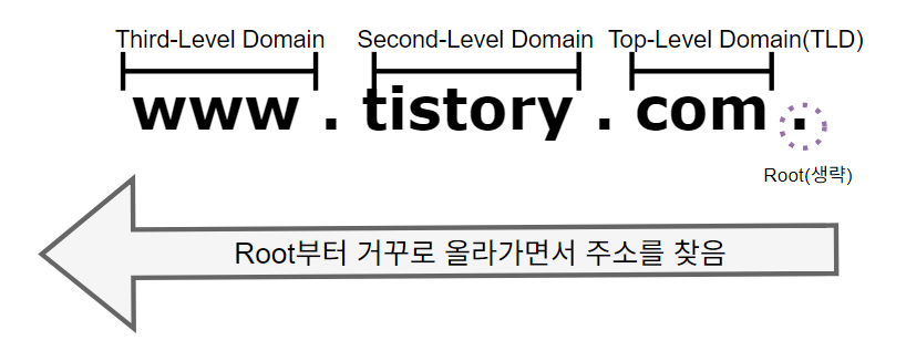 생김새는 그래보이지 않지만 취상위 루트부터 Top-level 도메인, Second-level 도메인, Third-level 도메인이 존재하며, 하위 레벨로 원하는 주소를 단계적으로 찾아간다.