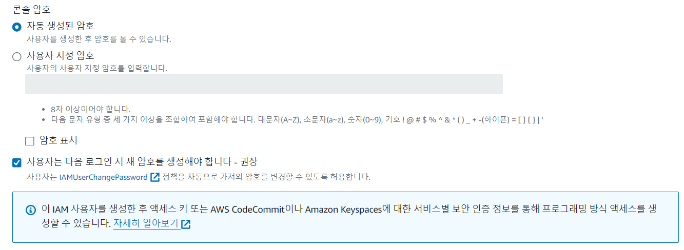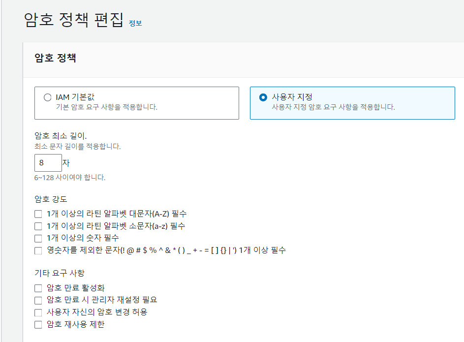 IAM 사용자가 비밀번호 변경하고 싶을 때는 IAM 메뉴에서 변경해야 하는데, IAM 권한이 없기 때문에 이용할 수 없다.