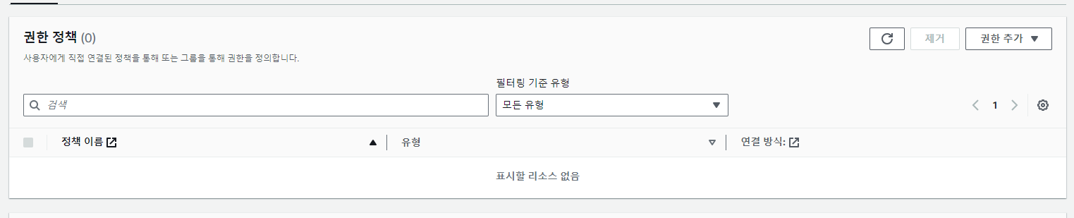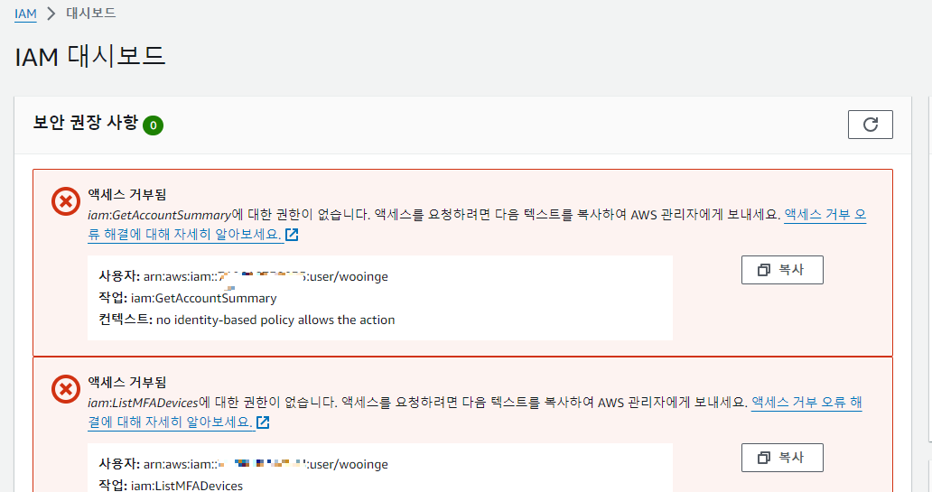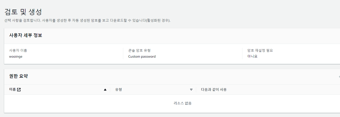 권한 아무것도 안 주고 IAM 계정 생성!