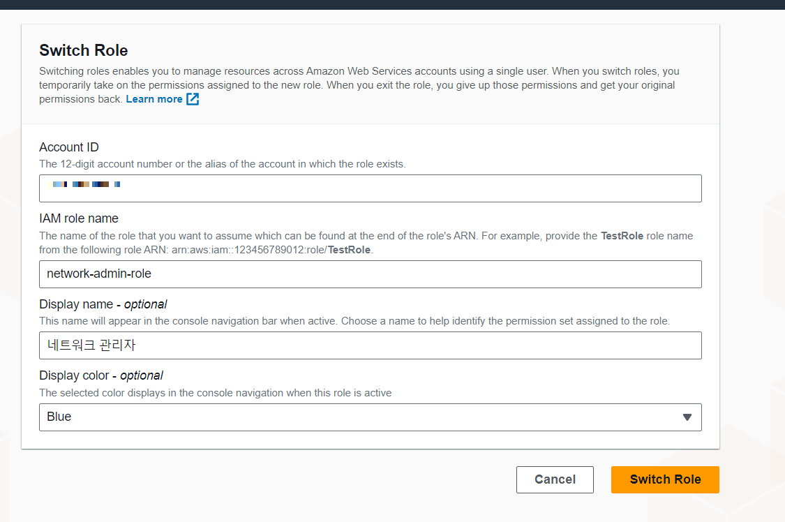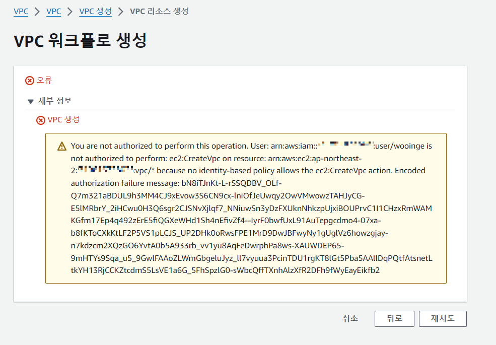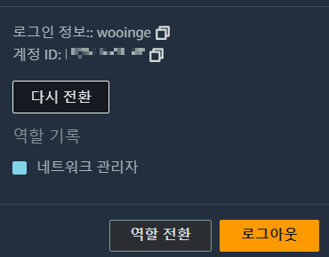 다시 전환을 눌러 역할을 바꾸면 네트워크 관리자 모자를 벗은 것이기 때문에 VPC를 생성할 수 없다.