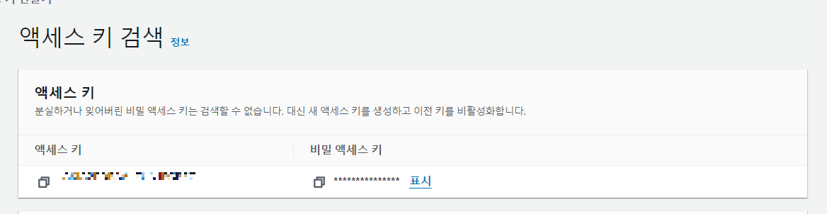 키가 생성되면 아래의 사진처럼 액세스 키와 비밀 액세스 키를 알려주는데,