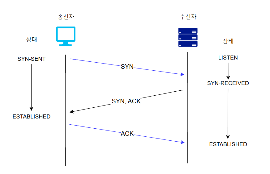 | SYN-SENT | 통신을 시도할 때 SYN 패킷을 보냄 | 접속을 받아들일 수 있는 상태 | LISTEN |