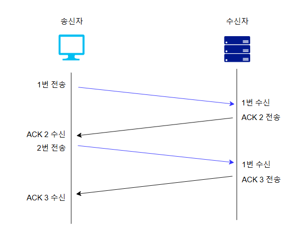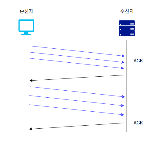 - 이러한 송수신이 이루어질 때 송신자와 수신자가 멀리 떨어져 있으면 왕복 지연시간(Tound Trop Time, RTT)이 늘어나 모든 데이터를 전송하는 데 오랜 시간이 걸리게 된다. 이때, 패킷을 하나만 보내는 것이 아니라 많은 패킷을 한번에 보내고 응답을 하나만 받는 식으로 이루어질 수 있다.