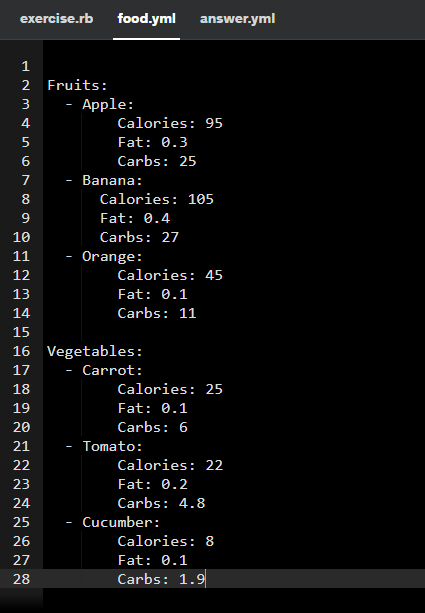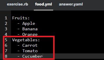 연습 문제 2 - food.yml 파일에 Vegetable-Carrot, Tomato, Cucumber 추가하기