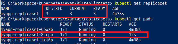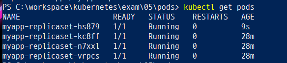 pod 1개를 지워도 레플리카셋이 새로운 pod를 생성하여 최소 개수인 3개가 실행되고 있는 것을 확인할 수 있다.