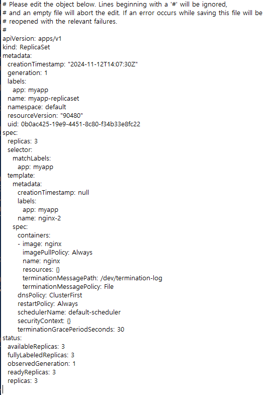 그래서 결국 레플리카셋(ReplicaSet)은 무엇이냐? 복제를 설정하는 기술이다. 몇 개 복제할 것인지? 어떤 pod를 복제할 것인지?에 대한 코드를 작성하여 최소 pod의 수를 유지할 수 있도록 한다.