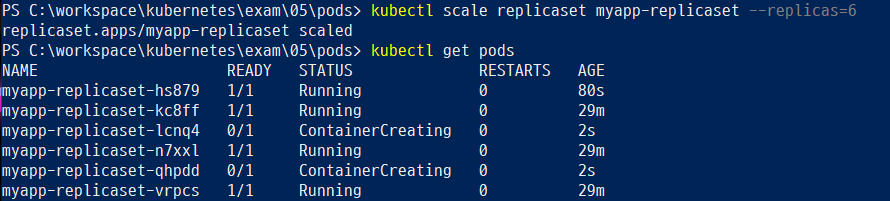 > kubectl scale --replicas=6 replicaset myapp-replicaset → type과 레플리카셋 이름을 이용하였음