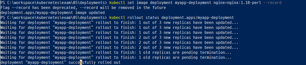 롤아웃의 상태를 확인하기 위해서는 kubectl rollout status [Deployment 이름] 명령을 사용하면 되고,
