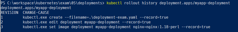 애플리케이션의 롤아웃 기록을 확인하고 싶으면 kubectl rollout history [Deployment 이름] 명령을 사용하면 된다.