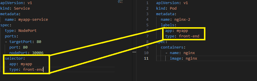 포트를 모두 작성하였으면, 어떤 pod의 targetPort인지 작성을 해줘야하는데, 이는 selector를 작성하여 서비스와 pod를 연결할 수 있다.