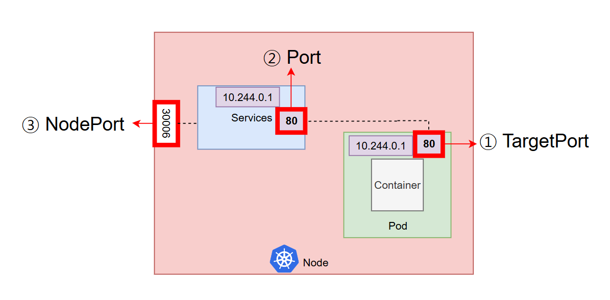 NodePort 서비스는 3가지 포트와 관련되어 있다.