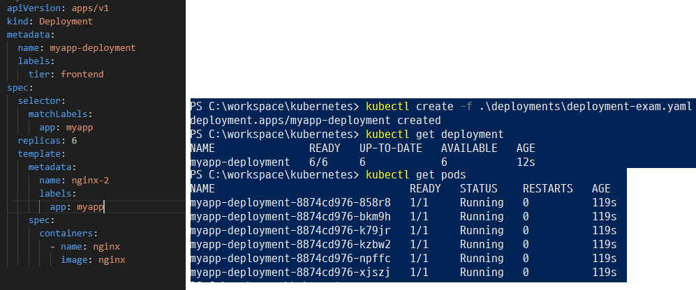 기존에 작성한 Deployment를 생성하여 6개의 pod를 실행한다.
