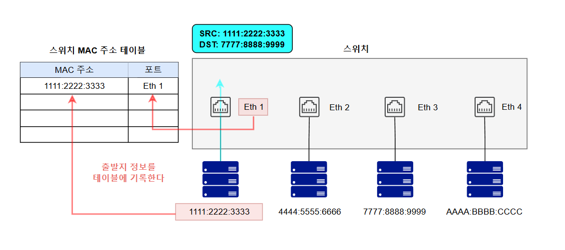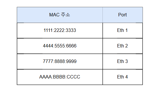 패킷이 특정 포트에 들어오면 출발지 MAC 주소와 포트 번호를 MAC 주소 테이블에 기록하게 된다.
