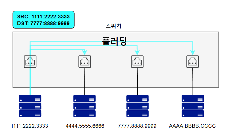 스위치가 허브처럼 모든 포트로 패킷을 보내는 동작을 플러딩이라고 한다.