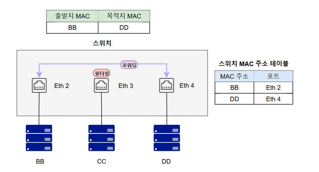 * MAC 주소 테이블: MAC 주소와 단말이 위치하는 인터페이스 정보를 매핑한 테이블