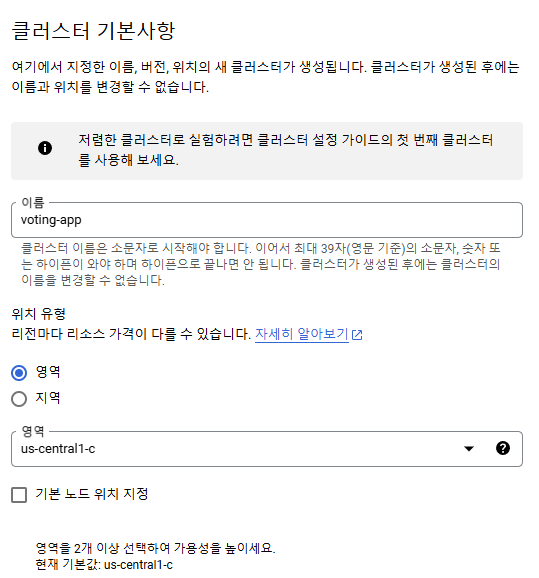 누르게 되면 새로운 클러스터 생성 폼이 나온다.... ㅠ ㅠ ㅠ