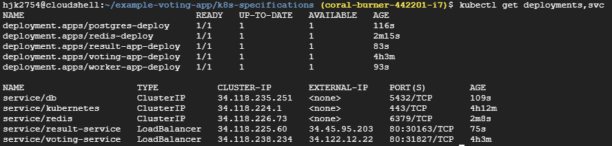 kubectl create -f 명령어를 사용하여 모든 deployment와 service를 실행한다.