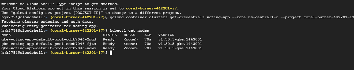 클러스터를 google shell을 이용하여 연결하고, kubectl get nodes 명령어를 실행하면 3개의 노드가 준비된 것을 확인할 수 있다.