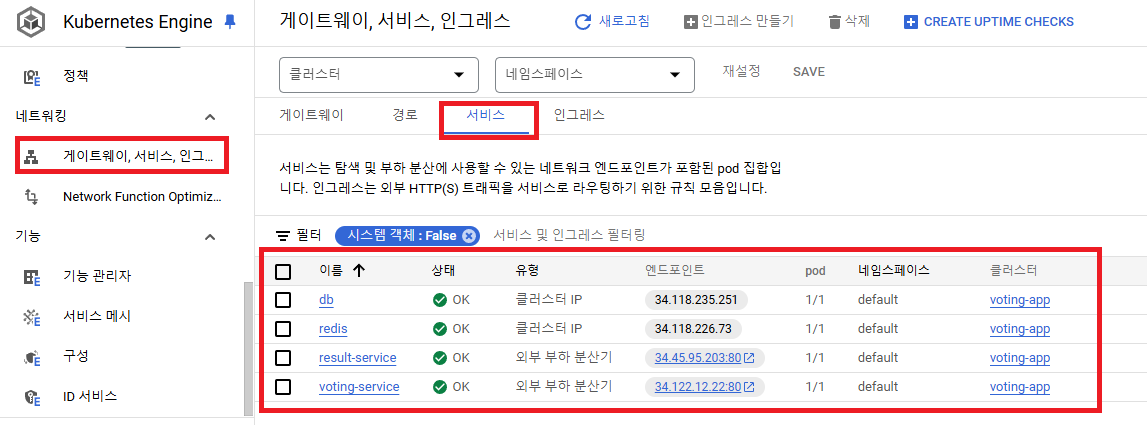 구글 클라우드의 쿠버네티스 엔진 > 게이트웨이, 서비스, 인그레스 탭에 들어가면 현재 생성된 유형의 서비스와 엔드포인트를 확인할 수 있다.