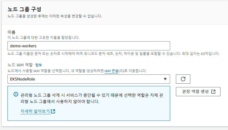 노드 그룹을 구성하기 위해서는 클러스터를 생성했을 때처럼 IAM 역할이 필요하다. 권장 역할을 생성하여 노드 IAM 역할을 선택한다.