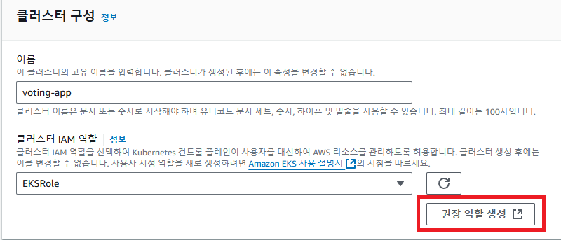 EKS 클러스터 구성을 위해선느 역할이 필요하다. 권장 역할 생성을 누르면 자동으로 EKS 역할을 생성할 수 있다.