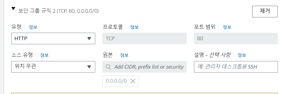 웹 서버 접속을 위해 보안 그룹(방화벽)에 http 유형을 추가한다.